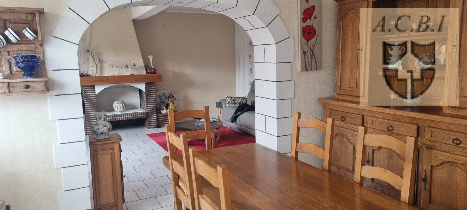 Elle se compose: entrée, salle à manger avec cheminée insert ouverte sur salon avec cheminée, cuisine A/E, 3 chambres, salle de bains, wc. Sous-sol: garage, buanderie, atelier, cave. 2 autres garages. Abris de jardin. Puits. Tout à l'égout? chauffage central fuel.
