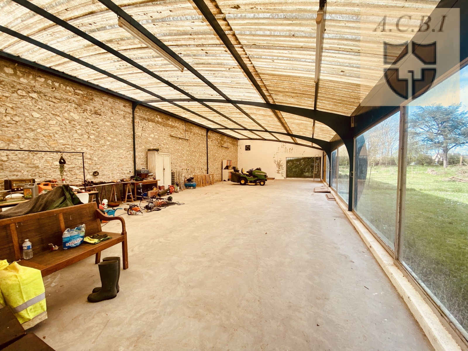 La maison s'ouvre au sud, à l'est et à l'ouest sur la propriété, avec son parc arboré totalement clos, profitant d'une immense véranda (ancienne piscine interieure), d'un espace terrasse, un bûcher, et d'un puits actif.